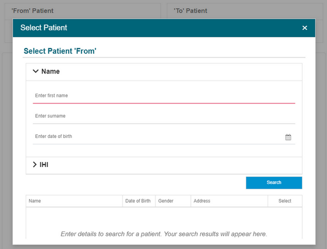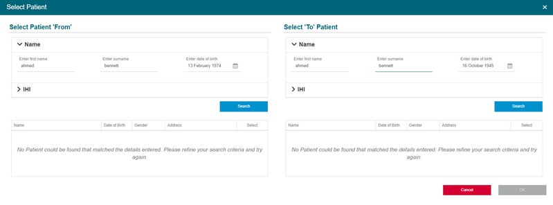 - In the Search Patient popup, search for and select the 'From' Patient and the 'To' Patient.