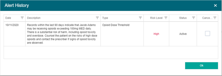 When an alert is cancelled, the Warning icon is removed from the Medication History grid.