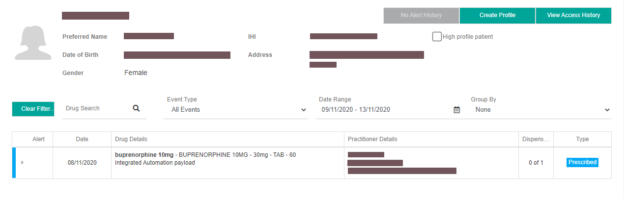 - Dispense events display the details of the pharmacist, plus the details of the prescriber.