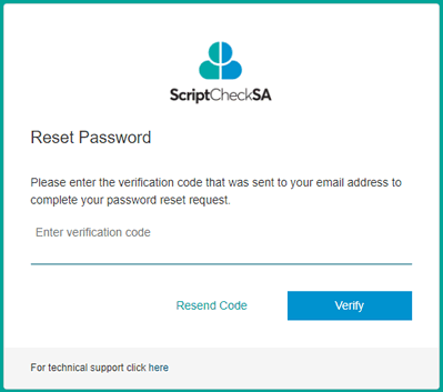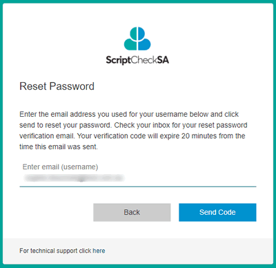 In Reset Password, enter your ScriptCheckSA username (email address), then click Send Code.